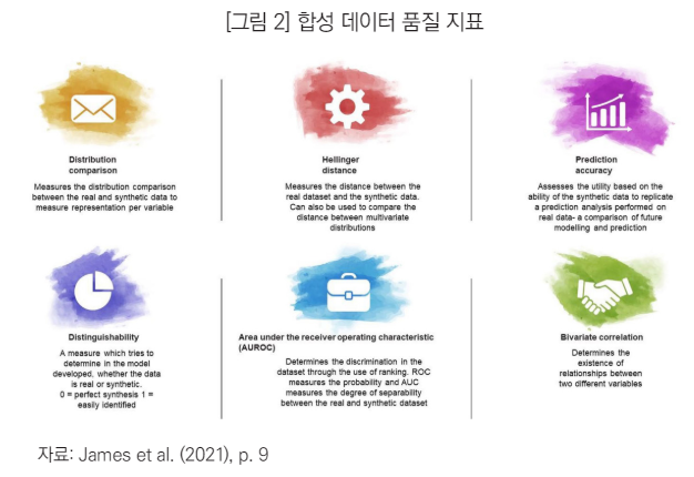 (품질 평가) 데이터 효용을 측정하고 원 데이터 세트와의 유사성을 확인하는 대표적인 합성 데이터 품질 지표는 다음과 같음(James et al., 2021)