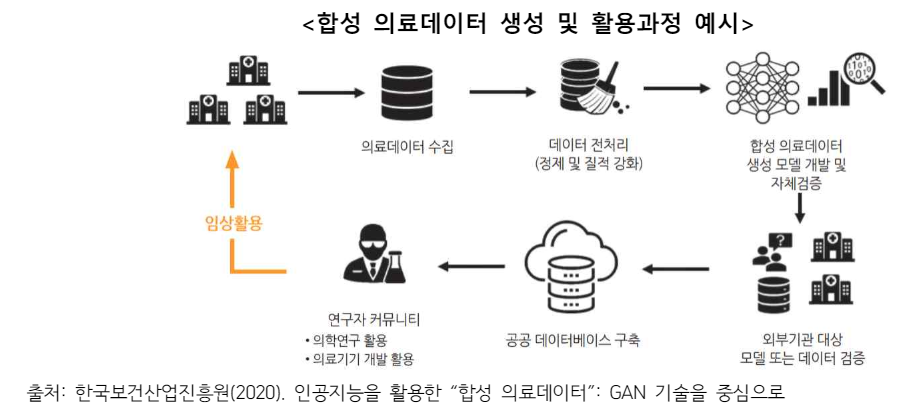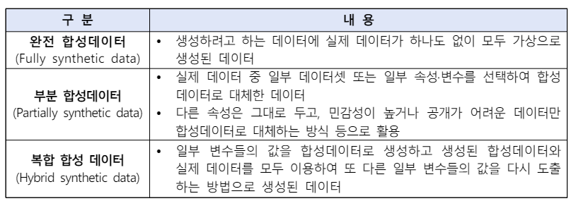 - 유럽데이터 보호 감독기구(EDPS)는 “원래 데이터 소스를 가져와 유사한 통계 속성을 가진 새로운 인공데이터를 생성하는 것”으로 정의(최은창, 2022)