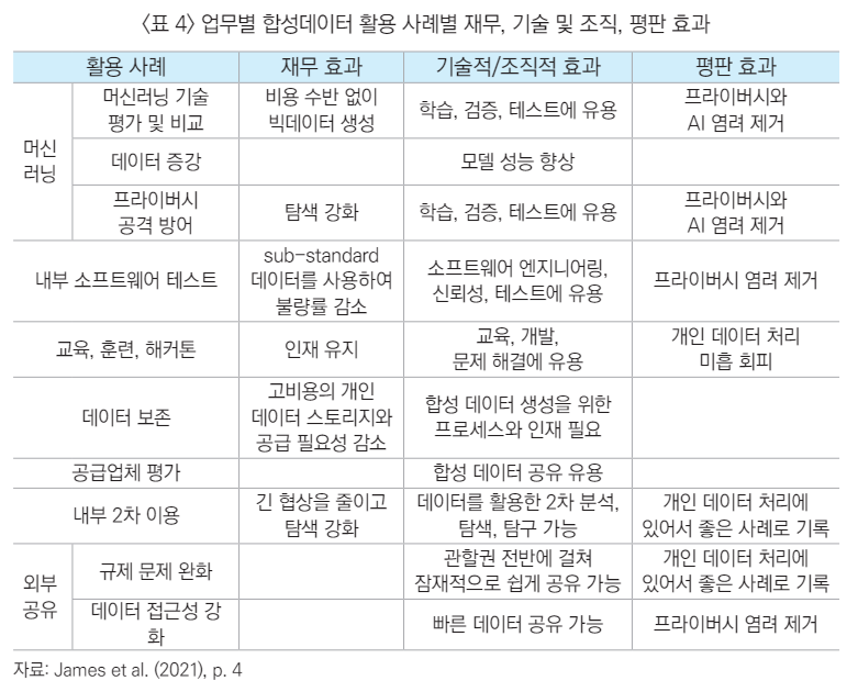 4) (법적 제약 해소) 합성데이터는 분석 등 2차 목적의 데이터 활용에 대한법적 제약(추가 동의, 보호조치 등)을 해소하는 방법 중 하나로 활용 가능