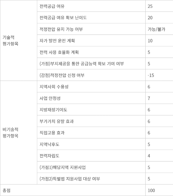 - 정책적 평가 항목: 전력 자립도, 전력 정책 부합도, 전력 수요 분산화 효과 등 (20점)