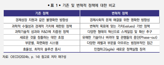 - ╺︎6개의 정책방향은 ① 방향성 강화; ② 가치 기반 STI; ③ 혁신의 발현과 확산 촉진; ④ 유해한 기술과 관행의 중단; ⑤ STI 정책들 간 정합성; ⑥ 민첩성과 정책실험으로 구성되어 있으며, 기존의 정책들과 비교하면 다음 표와 같은 차이가 나타남