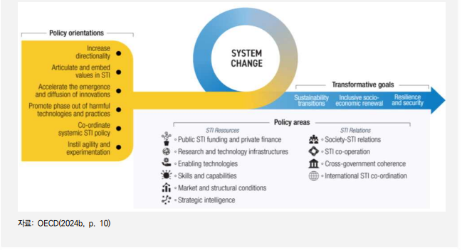 - ╺︎(2023.10.) 제123차 CSTP 총회에서 OECD는 S&T Policy 2025의 핵심 성과물로서, 변혁적 STI 정책을 제안하며, 산적한 글로벌 문제를 해결하기 위해 STI 정책 및 거버넌스의 재설계를 주장(OECD, 2023)