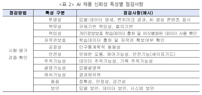 • AI 제품 신뢰성 : 투명성, 공정성(편향관리), 안전성, 설명가능성, 정확성, 강건성, 안정성 등