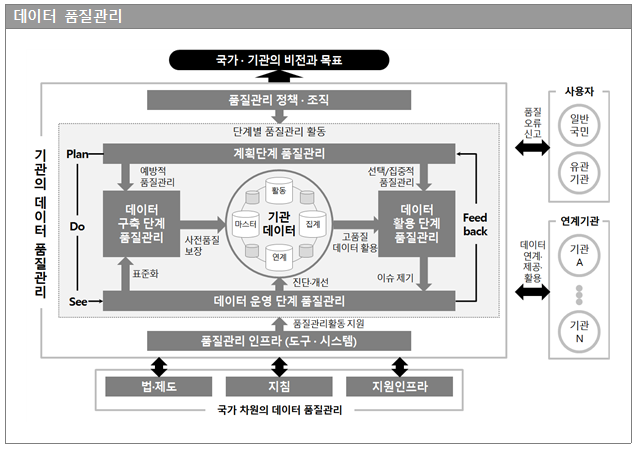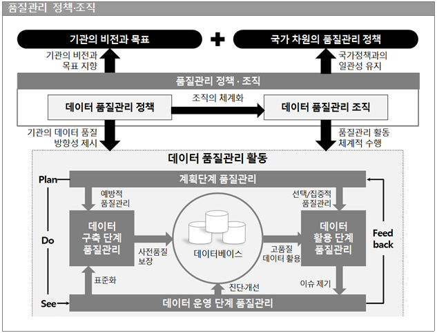 1.품질관리체계:1)계획(정책수립/조직구성/계획수립) 2)구축(데이터표준관리/데이터구조관리/연계데이터관리) 3)운영(데이터품질진단/데이터정제/근본원인분석&해결) 4)활용(데이터개방관리/데이터품질성과관리)