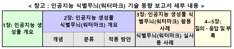 - 과기정통부와 한국정보통신기술협회도 우리 기업을 대상으로 인공지능 생성 결과물에 삽입할 수 있는 식별무늬(워터마크)의 기술적 적용 방법 및 활용 사례 등을 정리한 보고서 발간을 추진