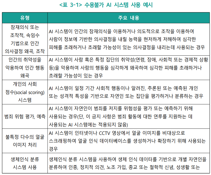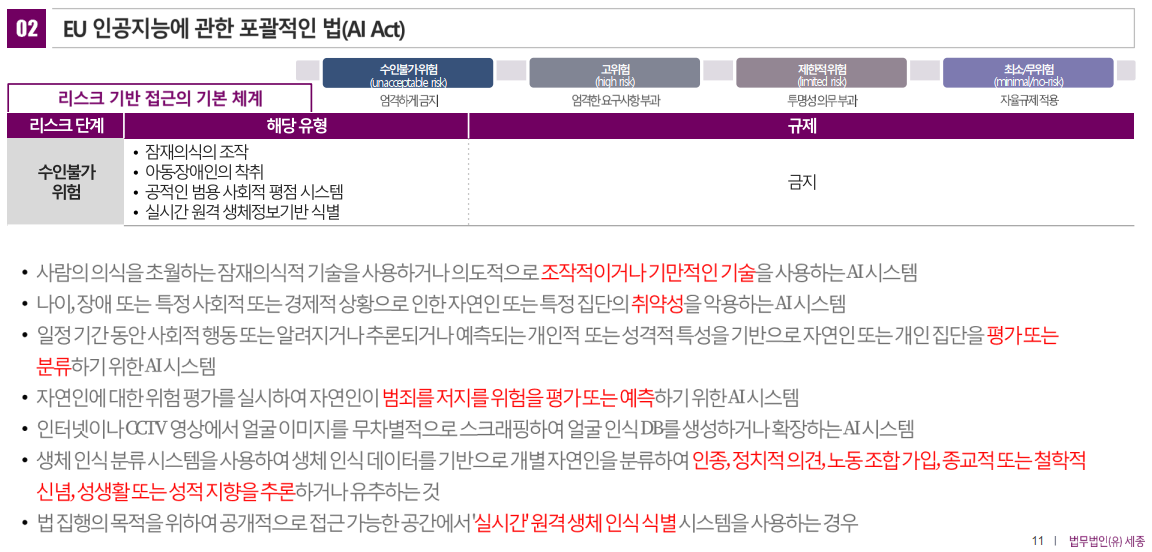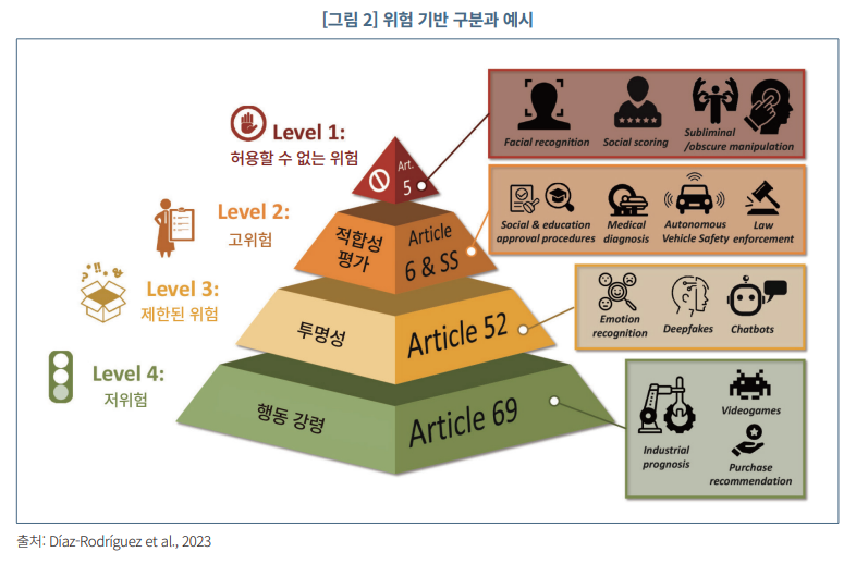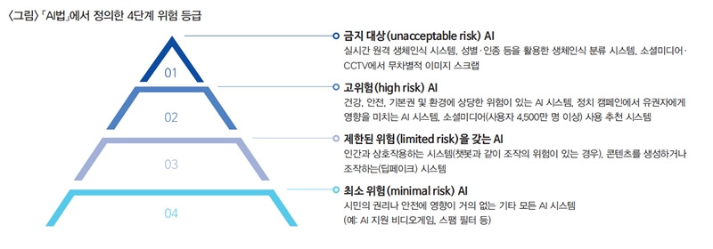 특히 AI 시스템의 위험도를 기준으로 규제를 달리하는 '위험 기반 접근법(Risk-based approach)'을 채택해 엄격한 규제를 적용하거나 심지어는 금지한다.