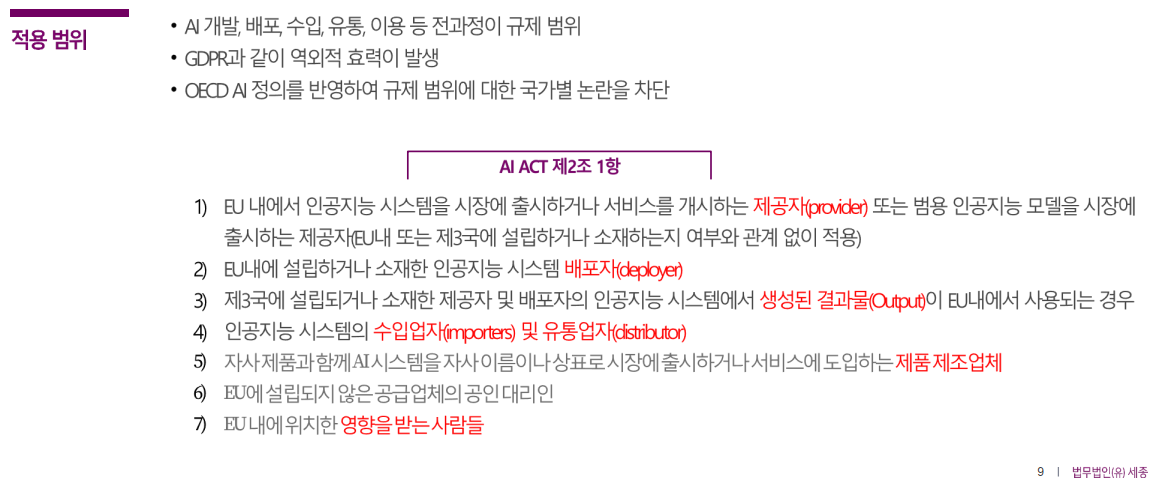 ● (적용범위) EU 내 사람들에게 영향을 미치는 모든 AI 시스템에 적용(AI 시스템이 EU 내에서의 구축・운영 여부와 관계없이 모든 부문에 걸쳐 적용, 어떠한 경우에는 AI 법이 해당 법 이전 시장에 출시된 AI 시스템에도 적용). AI 가치사슬의 모든 행위자에게 서로 다른 의무를 부과
