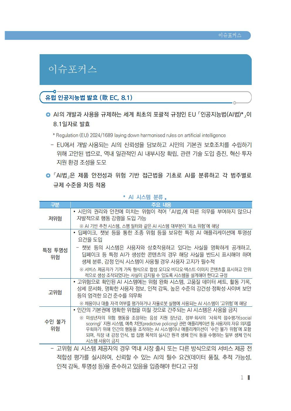 e-book 보기 이슈 ISSUE 유럽연합 인공지능법(EU AI Act)의 주요내용 및 시사점 책임 있는 AI를 위한 기업의 노력과 시사점 포토에세이 PHOTO ESSAY 중간-이호준 포커스 FOCUS 디지털 무역 현황 및 이슈 AI 거