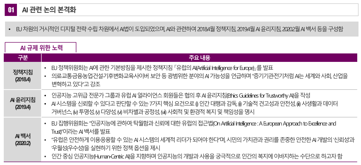 * ’19년 4월 ’신뢰할 수 있는 AI 윤리기준(Ethics Guidelines for Trustworthy AI)’ 발표, ’20년 2월 ’AI 백서(White Paper on AI)‘ 등의 정책 및 초기 논의를 바탕으로 인공지능법으로 발전함
