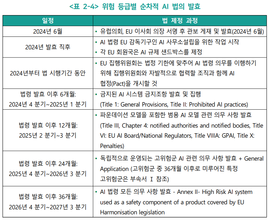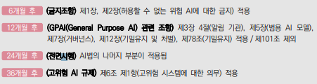- 일부 조항은 발효 뒤 6개월부터 적용, 이후 순차적으로 도입되어 ’26년 이후 전면 시행