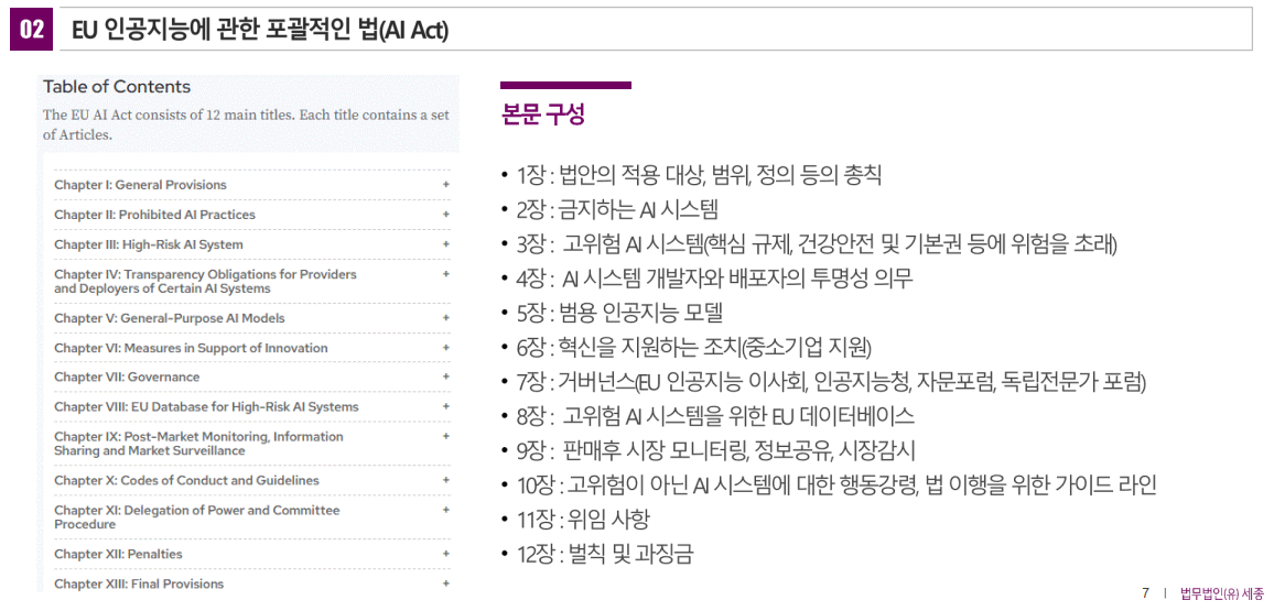 '금지 AI', '고위험 AI', '범용 AI 시스템' 등 총 12개의 주요 장으로 구성돼 있다.