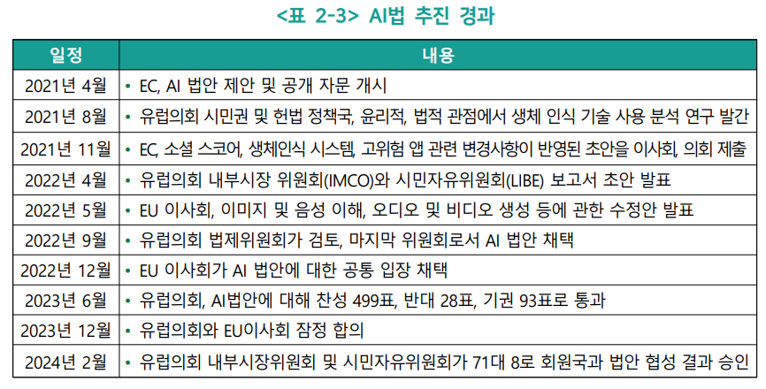 - (’24년 3월) 유럽의회 본회의에서 인공지능법안(세계 최초의 포괄적 AI법) 가결