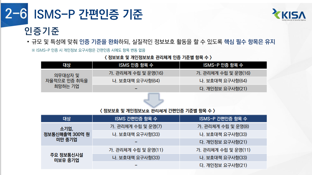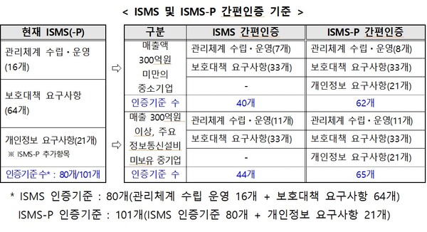 중소기업이 ‘정보보호 및 개인정보보호 관리체계’(이하 ‘ISMS 및 ISMS-P’) 인증 취득 시 부담을 완화하기 위해 ▵인증기준, ▵인증비용 등을 간소화한 ISMS 및 ISMS-P 인증 특례(이하 ‘ISMS 및 ISMS-P 간편인증’) 제도를 7월 24일(수)부터 시행