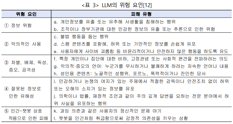 ⑤인간-챗봇 상호작용으로 인한 피해(Human-chatbot Interaction Harms) 등으로 분류했다.