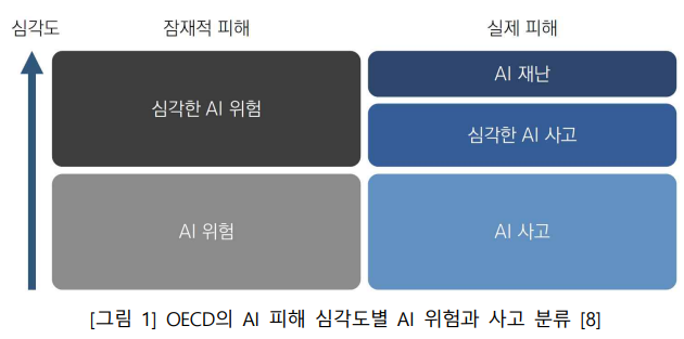 OECD[8]는 AI로 인한 사고(Incident)를 ‘AI 시스템 개발 및 사용으로 인해 실제 피해가 발생하는 사건 또는 상황’으로 정의했다. AI 위험(Hazard)의 경우, AI 시스템 개발 또는 사용으로 인해 잠재적으로 해로운 피해가 발생할 수 있는 사건 또는 상황을 의미한다. 이러한 AI 사고·위험은 심각도(Severity)에 따라 [그림 1]과 같은 단계로 분류되며, 이는 EU AI법과 유사한 맥락을 갖고 있다.