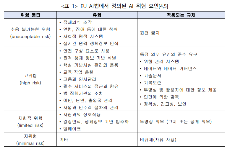 EU(유럽연합, European Union)는 지난 3월 세계최초로 AI 기술에 대한 포괄적인 규제 법안인 AI 법(AI act)을 본회의에서 통과시켰다. <표 1>과 같이 EU AI법에선 AI의 활용 분야를 위험성에 따라 구분했다.