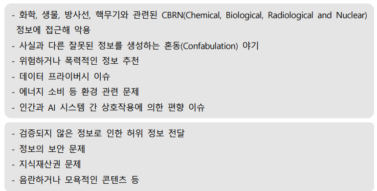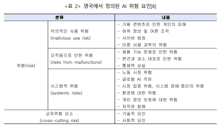 영국은 AI 안전 정상회의를 앞두고 AI 안전 국제과학보고서[6]를 발표했다. 해당 보고서는 범용적으로 개발된 AI가 야기할 수 있는 위험에 대해, 크게 위험(risk)과 교차위험 (cross-cutting risk) 두 가지로 구분했다. 각각의 세부 내용은 <표 2>에 기재했다.