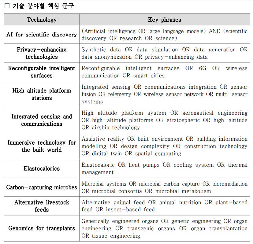 | <선정 방법> →︎ WEF의 글로벌 미래위원회 네트워크, 대학 및 연구 네트워크, 전 세계 2,000명이 넘는 주요 기관의 수석 편집자들이 참여하는 프론티어(Frontiers) 네트워크, 10대 신흥 기술 운영 그룹의 설문조사 실시 →︎ 신규성(Novelty), 적용성(Applicability), 깊이(Depth), 영향력(Power)을 종합적으로 검토하여 최종 10개 선정 →︎ CB Insights에서 얻은 특허, 펀딩, 지리적 분포 데이터 및 Dimensions에서 얻은 학술보조금 데이터 등을 활용해 추가 평가 실시 |