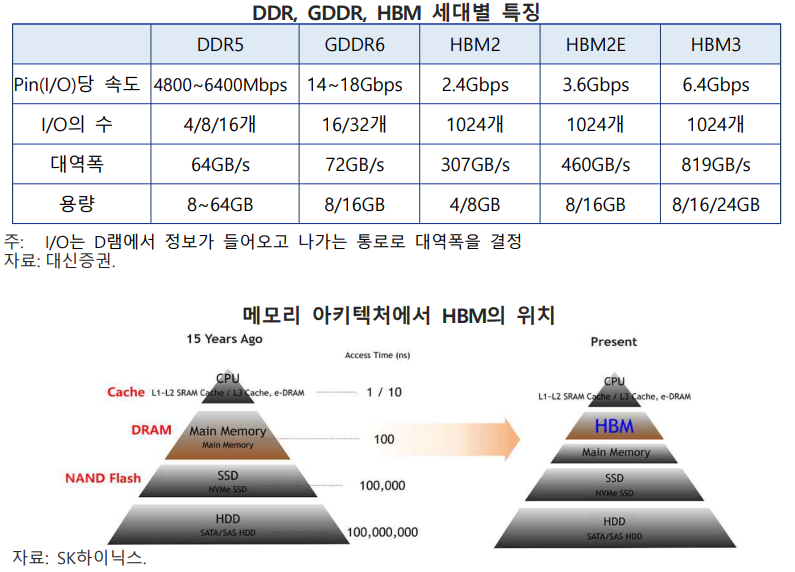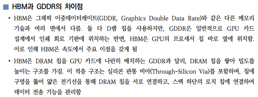 - 병목현상 해소를 위해 GDDR이 사용되었으나 2022년말부터 생성형 AI 열풍 등으로 고속, 대용량 메모리 수요가 큰 폭으로 증가하면서 HBM이 차세대 메모리로 부상