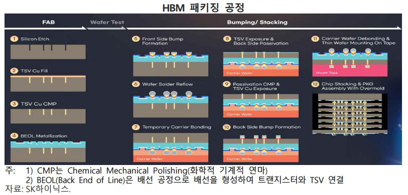 다수의 D램을 적층하고 실리콘관통전극(TSV, Through Silicon Via)으로 수직 연결해 기존 D램 대비 속도, 용량 등을 개선