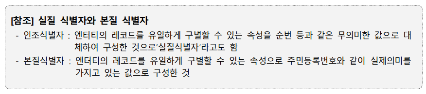[식별자] 엔터티의 각 레코드를 유일하게 대표할 수 있는 값을 가진 속성을 의미하며, 실질 식별자와 본질 식별자로 구분됨
