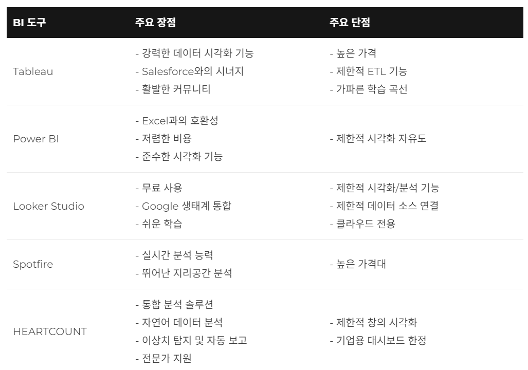 대표적인 BI 툴 Tableau, Looker Studio, Power BI, Spotfire, HEARTCOUNT의 장단점을 도입 담당자 및 실무자 관점에서 작성해 보았습니다.