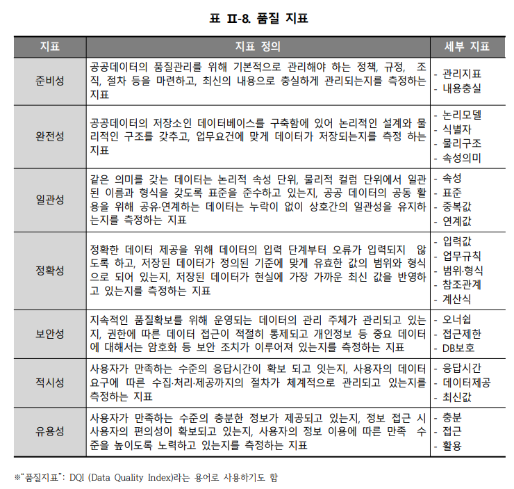 데이터 품질 지표 : 공공기관 데이터의 품질 수준을 측정하기 위한 기준을 제시한 것으로, 데이터 값과 DB구조에 대한 표준, 품질관리 수준, 사용자 서비스 측면을 고려하여 총 7개의 지표와 24개의 세부 품질 지표 특성으로 구성되며, DQI(Data Quality Index)라는 용어로 사용하기도 함