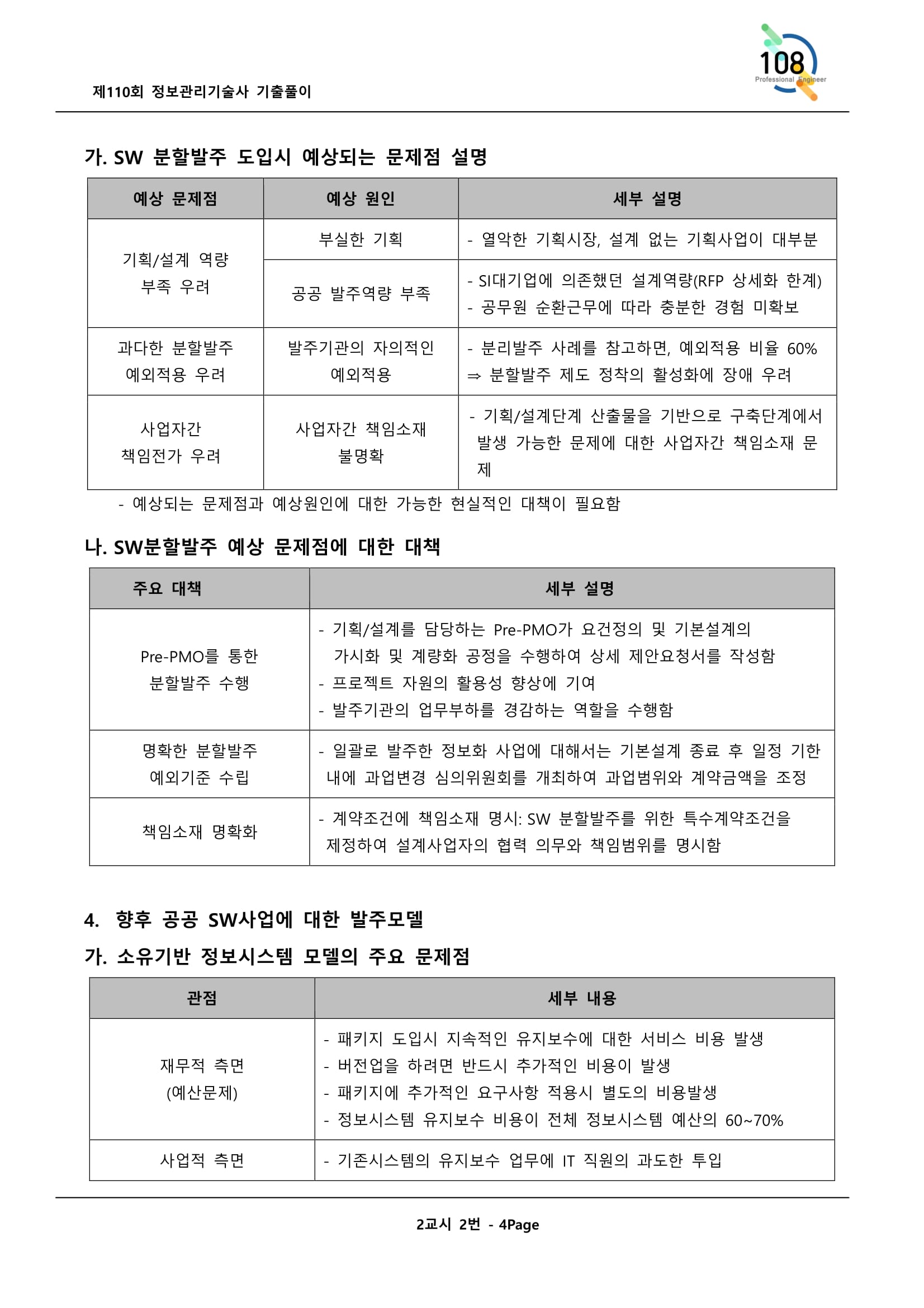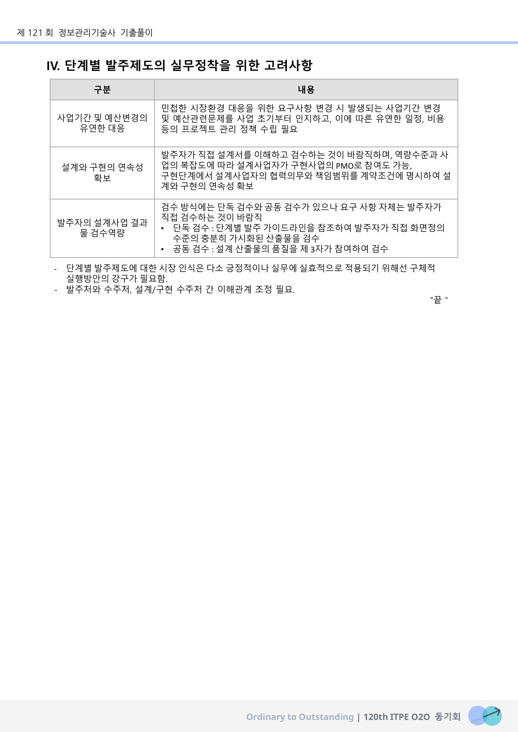 - 문제점: 끊임없는 요구변경, 무리한 수주로 하청업체 리스크 증대, 개발자 근무환경 저하