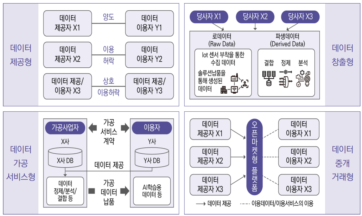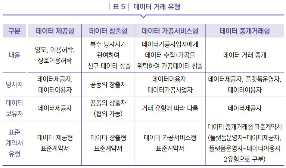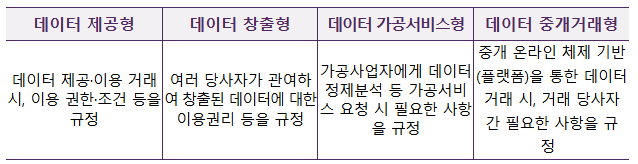 (구성) 데이터 제공형, 창출형, 가공서비스형, 중개거래형 총 4개 유형(5종)으로, 거래당사자는 거래 목적에 맞는 계약서를 선택하여 사용 가능