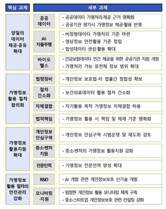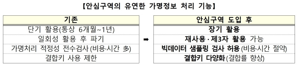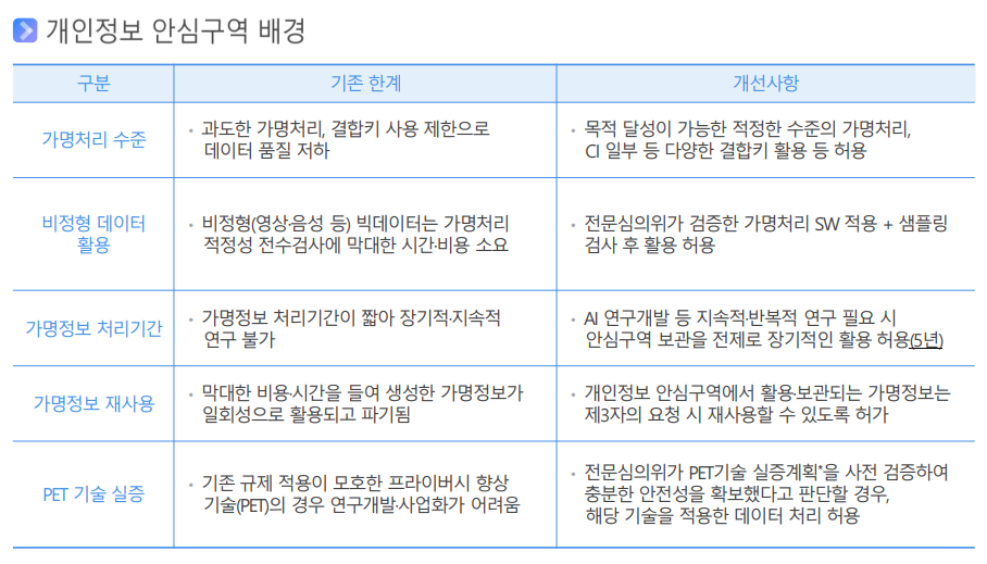 *** ▴가명처리 수준을 적정 수준으로 완화, ▴다양한 결합키 활용을 통한 결합률 제고, ▴지속적·반복적 연구를 위한 가명정보의 장기간 보관 및 제3자 재사용 허용, ▴빅데이터(영상·이미지 등) 표본(샘플링) 검사, ▴개인정보보호 강화기술(PET) 실증 등