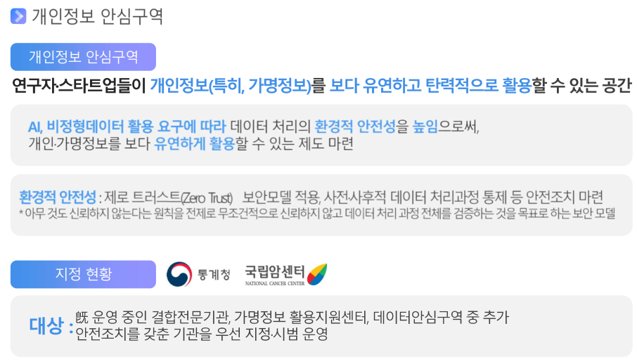 (개념) 제로 트러스트(Zero Trust)* 보안모델 기반의 안전조치, 사전·사후적 데이터 처리과정 통제 등 환경적 안전성**을 갖추면, 기존에 사실상 제한되어 왔던 다양한 데이터 처리***가 가능하도록 지원하는 제도