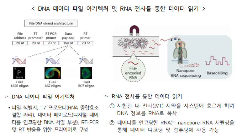 ※ DNA 데이터 파일에는 파일 식별자, 데이터 페이로드 및 특정 RNA 중합효소(T7, Sp6, T3 등)에 의해 작동되는 프로모터 서열을 포함하여 특정 파일만 선택적으로 읽어낼 수 있도록 설계 - -︎SDC에 저장된 DNA는 10번 이상의 반복적인 접근 실험에서 높은 안정성과 정확성을 유지하는 것을 확인