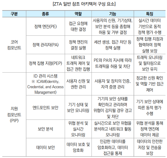 * 코어컴포넌트 : 정책 엔진(PE, Policy Engine), 정책 관리자(PA, Policy Administrator), 정책 집행 지점(PEP, Policy Enforcement Point) 등