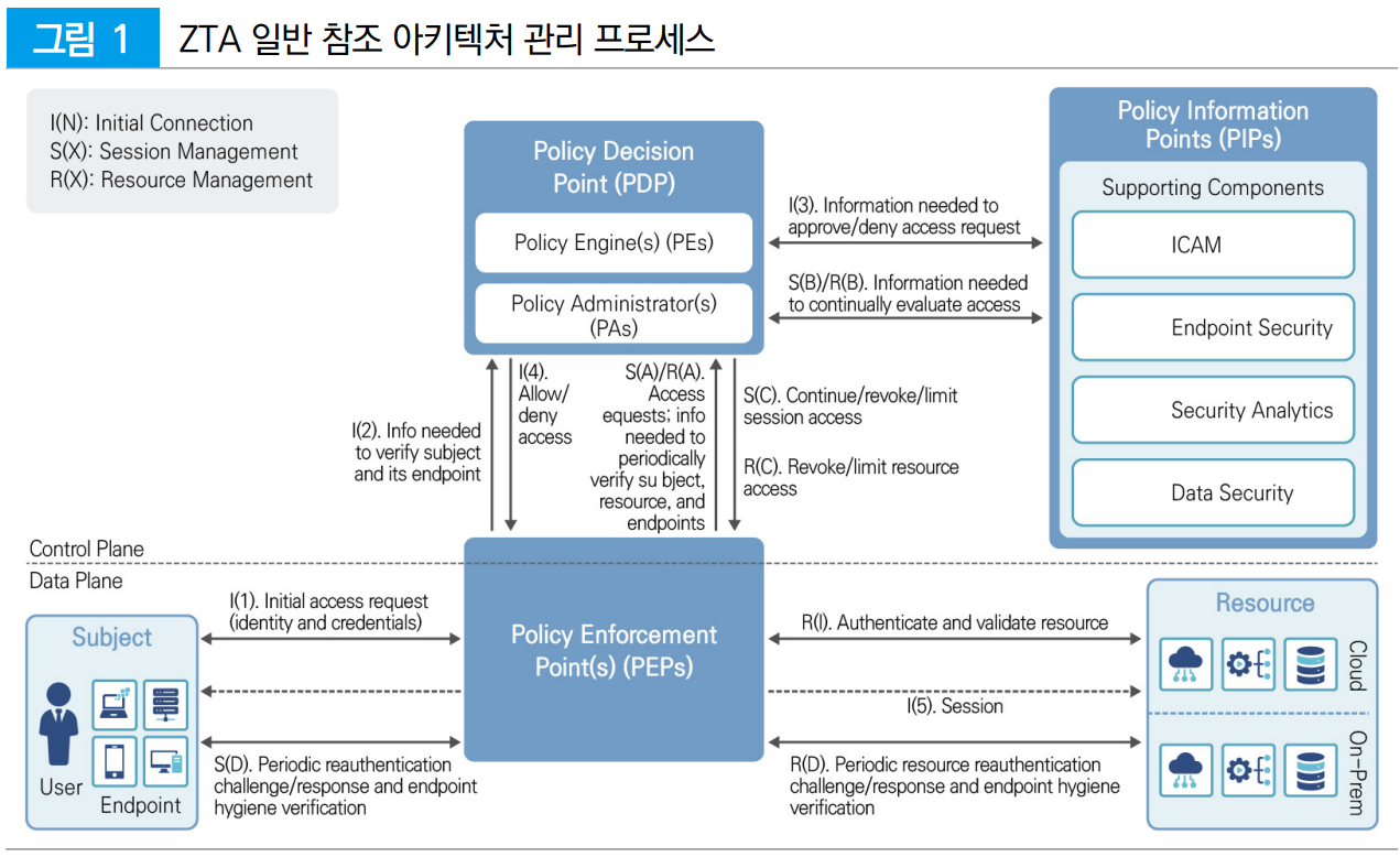 (ZTA 관리 프로세스) 사용자나 장치가 리소스에 접근하기 위해 거쳐야 하는 과정으로 초기연결, 세션관리 및 리소스관리로 구분