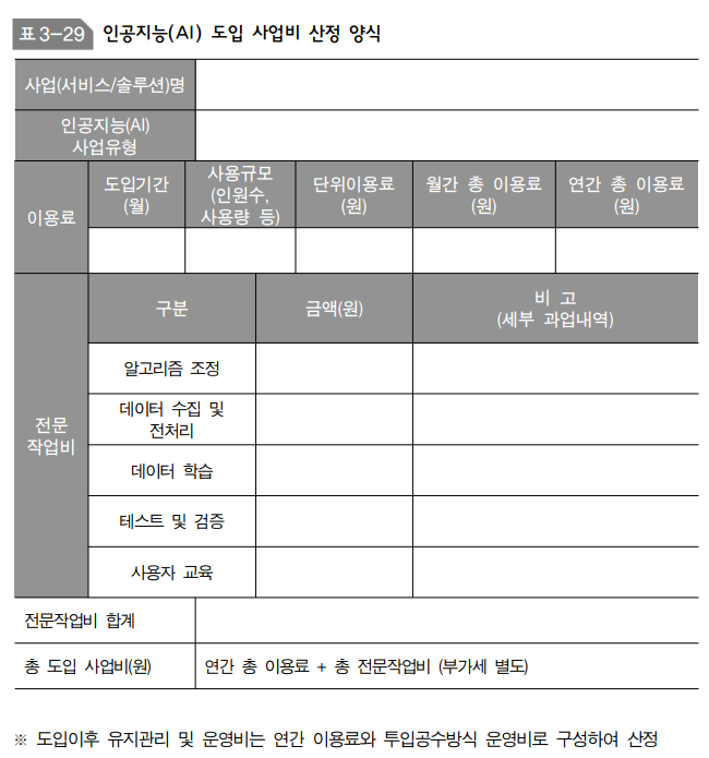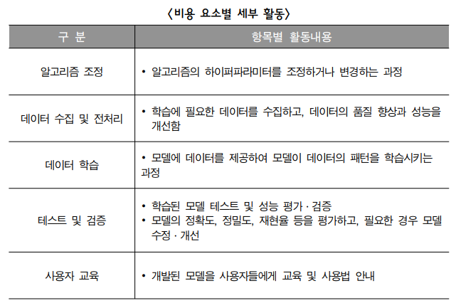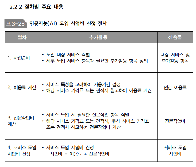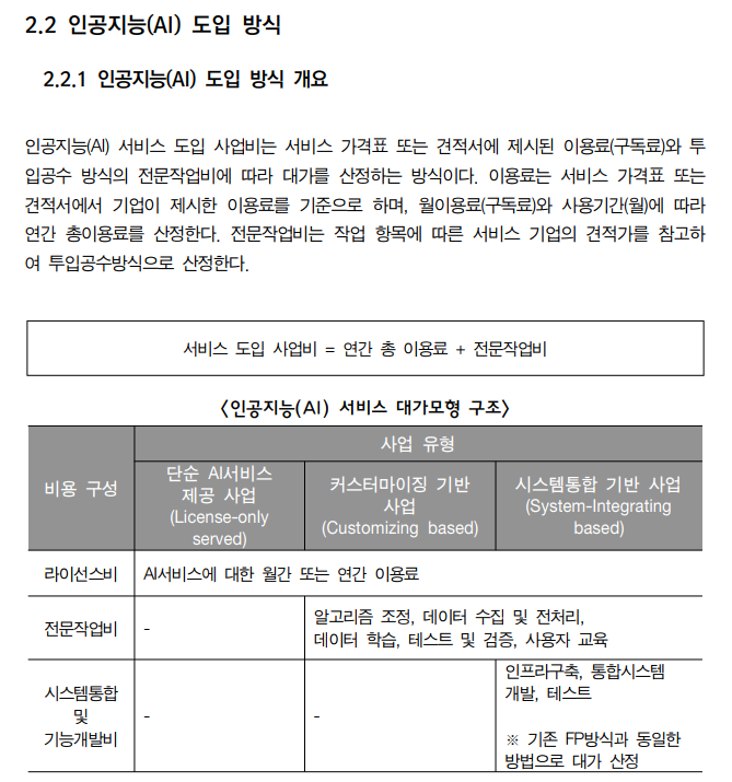 - SW 사업 대가산정 가이드, AI 관련 기술백서 등에서 AI 프로젝트 특성을 감안한 비용 구조 제시 가능. 정식 "AI 대가산정 가이드"가 있다면 해당 문서 참조.