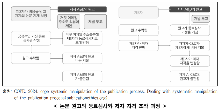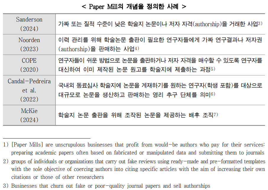 (개념) 가짜 또는 질적 수준이 낮은 논문 원고를 생산하여 저자 자격을 거래하고 해당 논문의 저자로 표시된 연구자를 대신하여 학술지에 논문 게재를 도와주는 영업 모델 또는 영리 추구 단체를 의미
