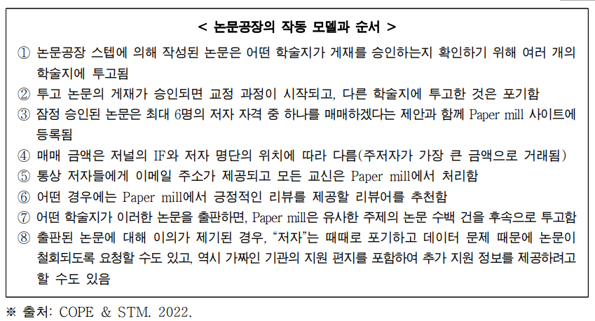 [목차] I. 서론 II. 논문공장(Paper Mills)의 개념 III. 논문공장 특징과 작동 원리 IV. 논문공장 이용 규모 V. 논문공장 이슈에 대한 대응 VI. 결론 및 시사점 ※ 현재 문서에는 다국어 문자음성변