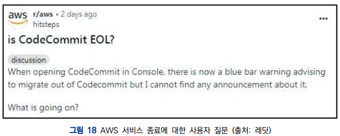 | 2024 | AWS | AWS CodeCommit, Cloud9, Amazon Forecast, CloudSearch 등 | 여러 관리형 서비스를 짧은 기간 내에 중단. 커뮤니케이션 부족으로 혼란 가중. | 다양한 AWS 서비스를 사용하던 고객들이 대체 솔루션을 탐색하고 워크플로 재구성 필요. | 서비스 종료 발표 시 명확한 커뮤니케이션. 대체 가능한 AWS 내 또는 외부 서비스 분석. |