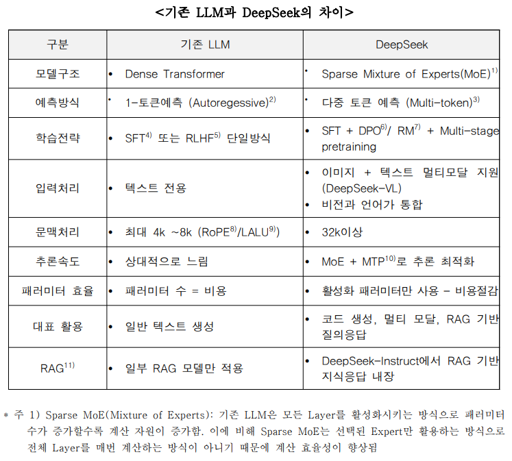 - '멀티헤드 잠재 어텐션(MLA)'과 '멀티토큰 예측(MTP)' 기능으로 중요한 세부 정보를 반복적으로 학습하고, 추론 속도를 향상.