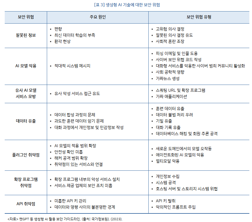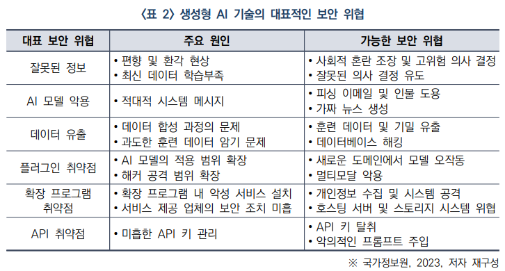 본 보고서는 생성형 AI 기술의 확산에 따른 주요 보안 위협을 분석하고, 이를 대응하기 위한 기술적, 정책적 방안을 제시합니다.