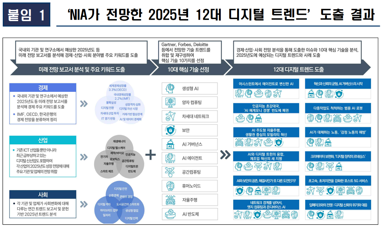 [IT & Future Strategy 2024-6] NIA가 전망한 2025년 12대 디지털 트렌드 2024.12.31 조회수 1902 이석형 미래전략팀 [IT& Future Strategy 2024-6] NIA가 전망한 2025년 12대 디지털 트렌드 연구 배경 및 목적 2025년 경제,