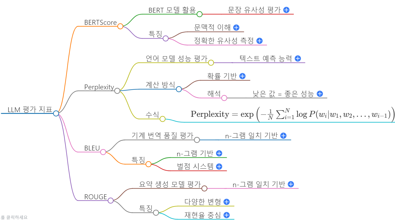 | Perplexity | 텍스트 예측력 | 언어 모델의 확률 기반 평가 | 생성 모델 평가에 적합 | 텍스트의 품질 직접 반영 X |