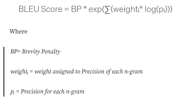 - 벌점 시스템: BLEU는 생성된 텍스트의 길이에 따라 벌점을 부여하여, 너무 짧은 텍스트가 높은 점수를 받지 않도록 합니다. 이는 모델이 다양한 길이의 텍스트를 생성하도록 유도합니다.