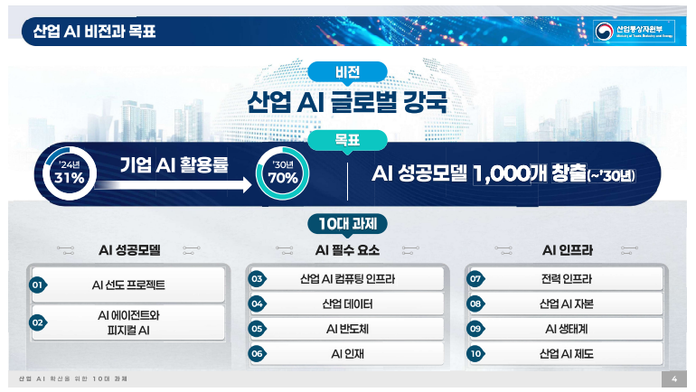 - 산업부는 이번 10대 과제가 지난해 9월 제1차 국가인공지능위원회에서 발표한 '국가 AI 전략 정책 방향'의 큰 틀에서 산업 AI 확산을 위한 우선 추진 과제를 전문가 논의를 거쳐 선정한 것이라고 설명함