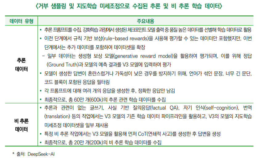 | ∙ 강화학습 과정이 일정 수준의 성능(수렴 단계)에 도달하면, 기존 모델의 성능을 보다 더 향상하기 위해 새로운 학습 데이터로 모델을 미세 조정하며, 이러한 과정은 다음과 같은 과정을 통해 수행 ① 거부 샘플링(Rejection Sampling): 강화학습을 통해 다양한 답변 중 품질이 높은 데이터만 선별 ② 지도학습 미세조정(SFT) 데이터 추가: ①에서 선별된 데이터와 기존 V3 모델에서 수집한 SFT 데이터(예: 글쓰기, 사실 기반 질의응답, 자기 인식 관련 데이터)와 결합 ③ 모델 재훈련(retrain): 새로운 데이터로 V3-Base 모델을 재학습시켜 더욱 정교한 AI 모델을 완성 |