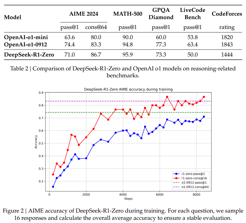 딥시크는 강화 학습(RL)을 통해 추론 기능을 향상시킨 딥시크-R1을 출시합니다. 여기에는 두 가지 핵심 모델이 포함됩니다: 감독된 미세 조정 없이 순수 RL을 사용하는 DeepSeek-R1-Zero와 RL과 콜드 스타트 데이터를 결합한 DeepSeek-R1이 그것입니다. DeepSeek-R1-Zero는 RL만으로도 모델이 정교한 추론 능력을 개발할 수 있음을 입증하며 AIME 2024에서 71.0%의 합격률을 달성하고 OpenAI-o1-0912의 성능과 일치하는 결과를 얻었습니다. 훈련 과정에서 자기 검증 및 반성과 같은 복잡한 동작을 자연스럽게 진화시켰습니다. 하지만 가독성과 언어 혼용이라는 문제에 직면했습니다. 이러한 한계를 해결하기 위해 DeepSeek-R1은 고품질 연쇄 사고 예제를 사용한 초기 미세 조정, 추론 중심의 RL 훈련, 거부 샘플링을 통한 새로운 훈련 데이터 수집, 모든 시나리오에 대한 최종 RL 최적화 등 다단계 접근 방식을 사용했습니다. 그 결과, 출력 가독성과 일관성을 유지하면서 AIME 2024에서 79.8%의 정확도와 MATH-500에서 97.3%의 정확도로 OpenAI-o1-1217과 비슷한 성능을 달성했습니다. 또한 딥시크는 7B 모델이 대형 경쟁사보다 뛰어난 성능을, 32B 모델은 OpenAI-o1-mini에 가까운 결과를 달성하는 등 딥시크-R1의 기능을 소형 모델에 성공적으로 분산시켰습니다. 이는 RL을 통해 직접 소형 모델을 학습시키는 대신 대형 모델에서 추론 패턴을 추출하는 것이 효과적이라는 것을 보여줍니다.