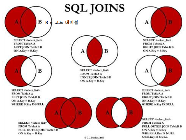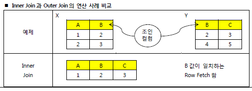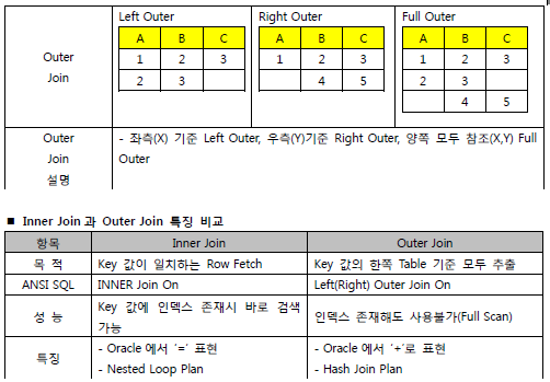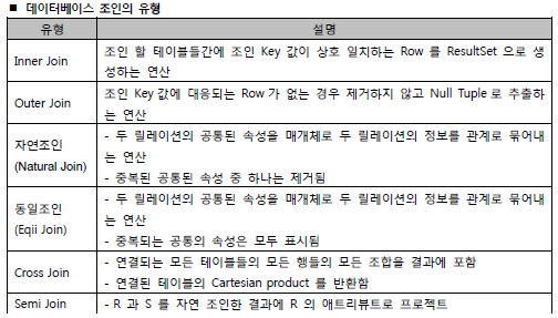 - Outer : 대응되는 튜플이 없는 튜플과 널 값을 갖는 튜플도 결과에 포함 (Left Outer, Right Outer, Full Outer)