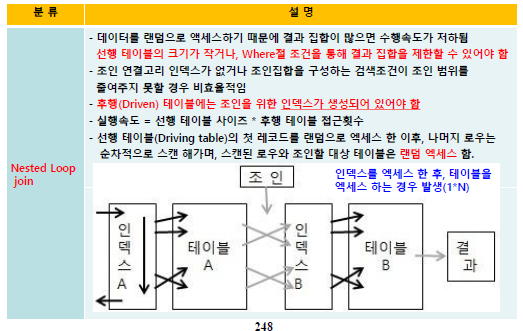- Nested Loop : 선행테이블(Driving Table) 추출 값으로 후행테이블 조인하는 방식 (테이블간 조인순서 조정)