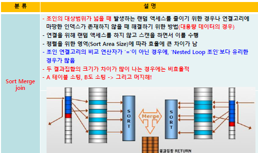 - Sort Merge : 조인 두 집합을 조인 속성으로 정렬하여 Sorted list 만든 후 이들을 병합하는 방식 (조인 Area 배치 업무시 사용)