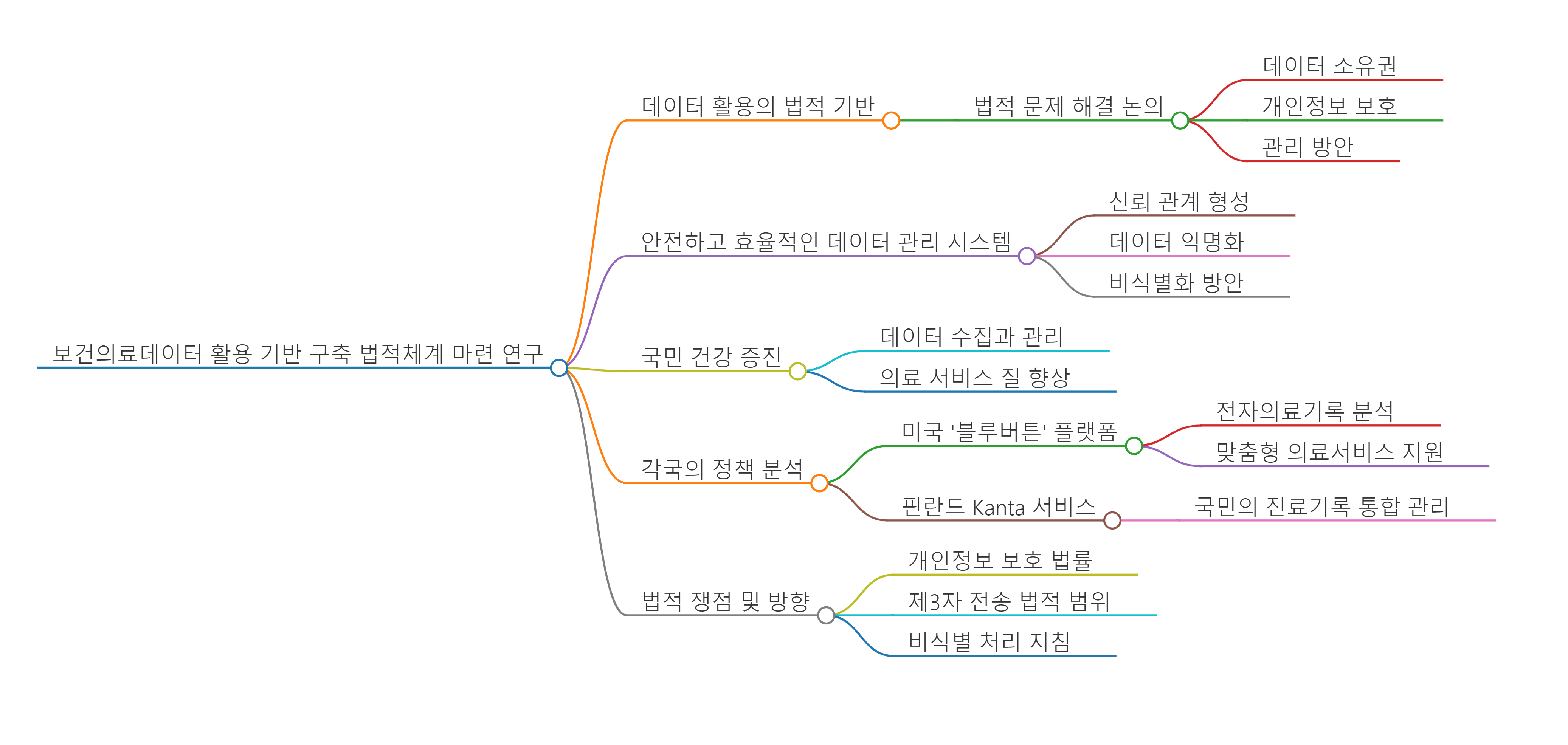 - 데이터 활용의 법적 기반: 보건의료 데이터의 활용 시 예상되는 법적 문제를 해결하기 위한 논의로, 데이터의 소유권, 개인 정보 보호 및 관리 방안 등이 포함됩니다.